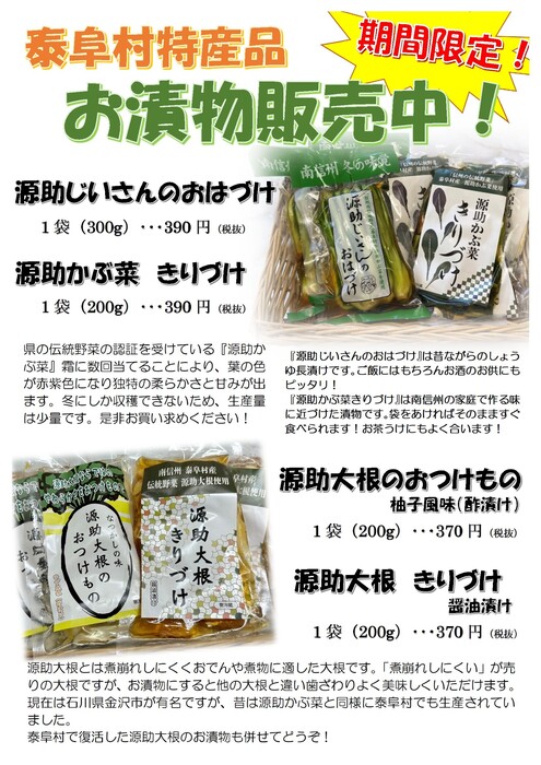 長野県の伝統野菜に認定されている泰阜村特産『源助蕪菜』のお漬物が販売開始されました。冬にしか収穫できないため、生産量はごく少量の期間限定品です。販売店は、泰阜村内では「東商店」、「JA泰阜店」、「泰阜村役場内特産品販売コーナー」。村外では「にしざか(阿南町富草)」 「ファミリーマートJA下條店」にて販売中です。合わせて源助大根の酢漬け、切り漬けも販売しております。是非、お買い求めください。 cleaned源助つけものポップ (取扱店空欄) (JPEG 133KB)